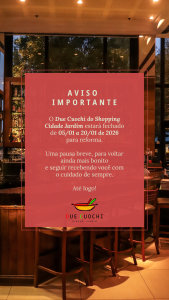 17/12/2025O Due Cuochi Cidade Jardim fará uma pausa de 05 a 20/01 para reforma.